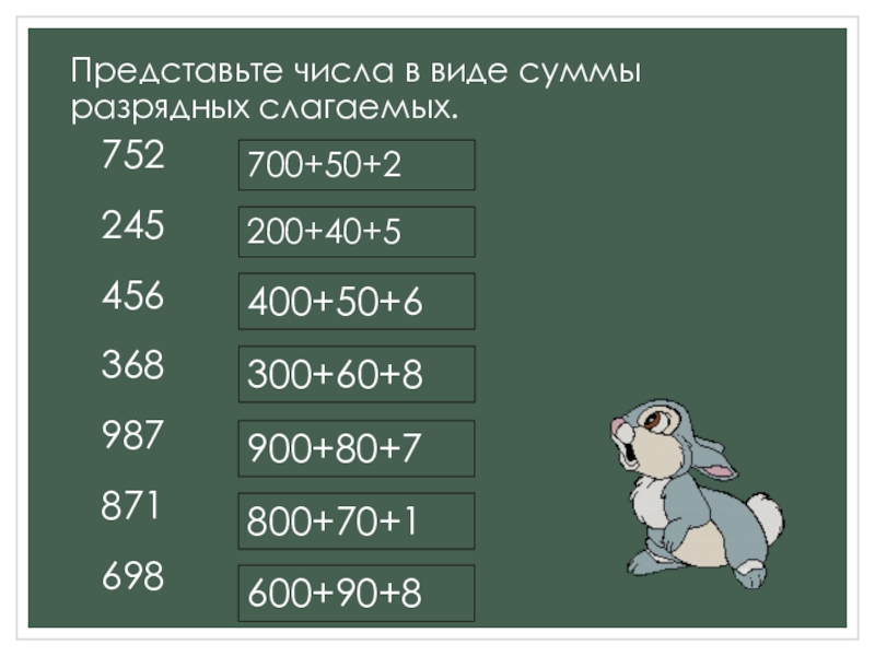 Представьте числа в виде суммы разрядных слагаемых.752  245  456  368  987  871  698700+50+2200+40+5400+50+6300+60+8900+80+7800+70+1600+90+8