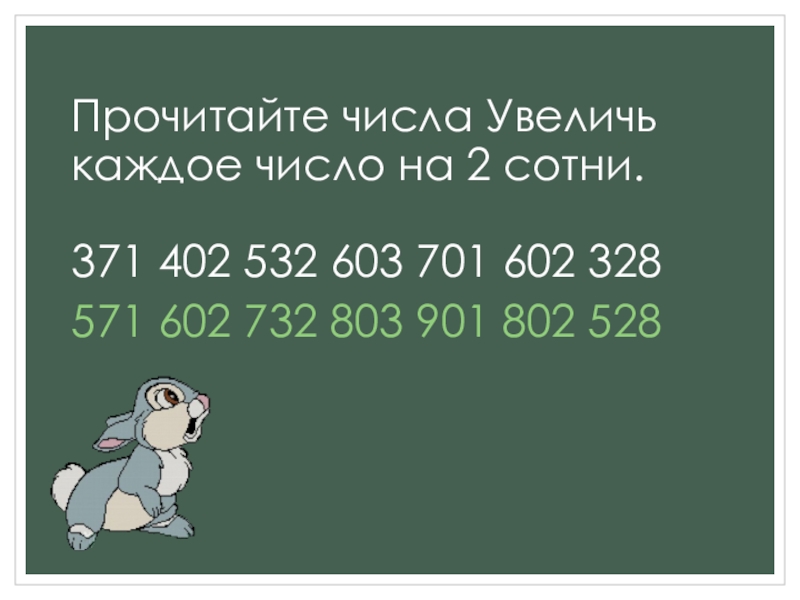 Прочитайте числа Увеличь каждое число на 2 сотни.  371 402 532 603 701 602 328  571 602 732 803 901 802 528