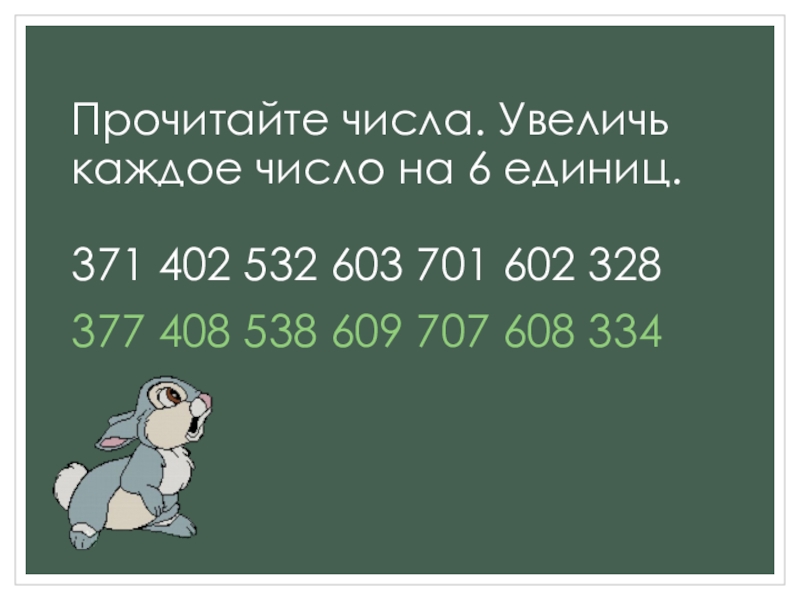 Слайд 3Прочитайте числа. Увеличь каждое число на 6 единиц. 371 402 532 603 701 602 328