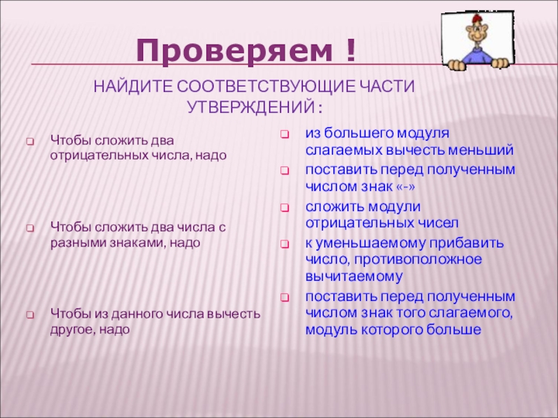 поставить перед полученным числом знак того слагаемого, модуль которого больше