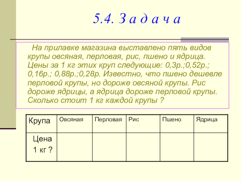 На прилавке магазина выставлено пять видов крупы овсяная, перловая, рис, пшено и ядрица. Цены за 1 кг этих круп следующие: 0,3р.;0,52р.; 0,16р.; 0,88р.;0,28р. Известно, что пшено дешевле перловой крупы, но дороже овсяной крупы. Рис дороже ядрицы, а ядрица дороже перловой крупы. Сколько стоит 1 кг каждой крупы ?
