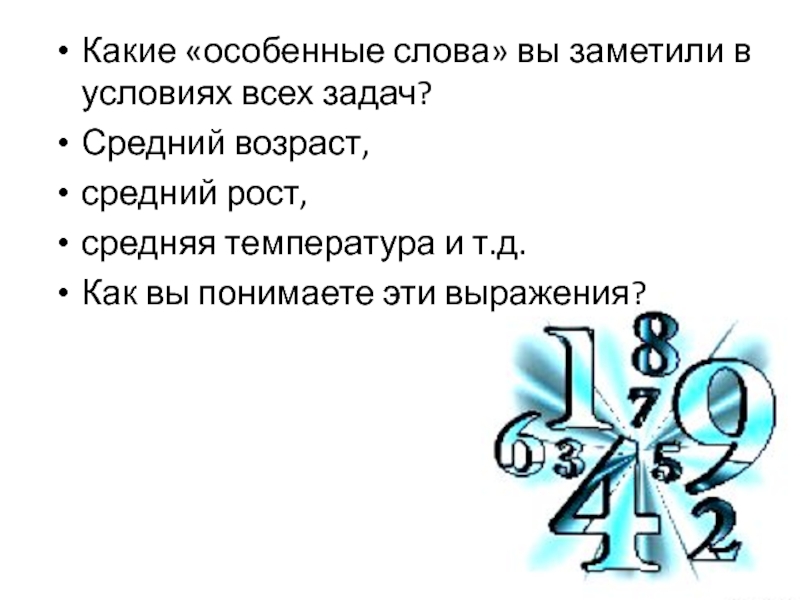 Слайд 9Какие «особенные слова» вы заметили в условиях всех задач?