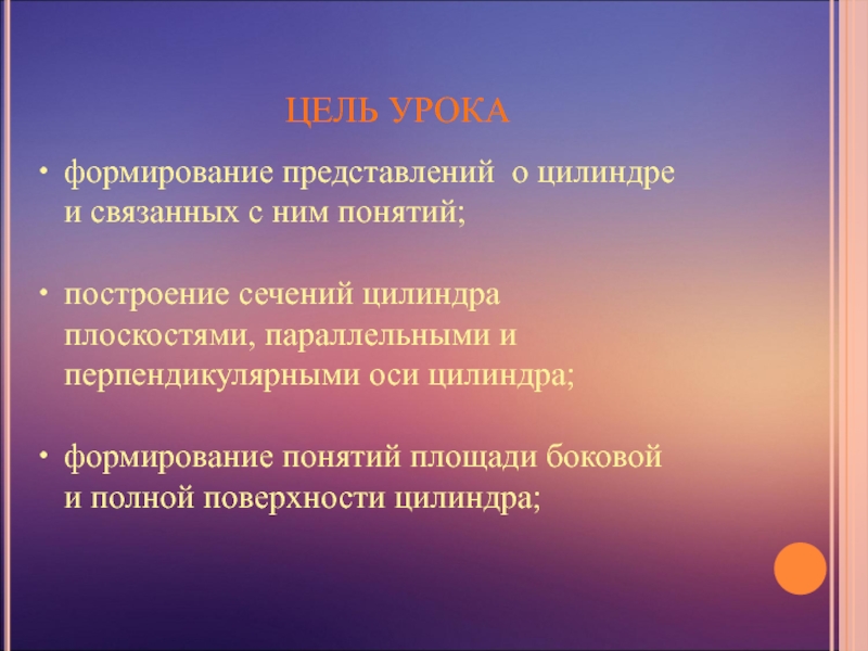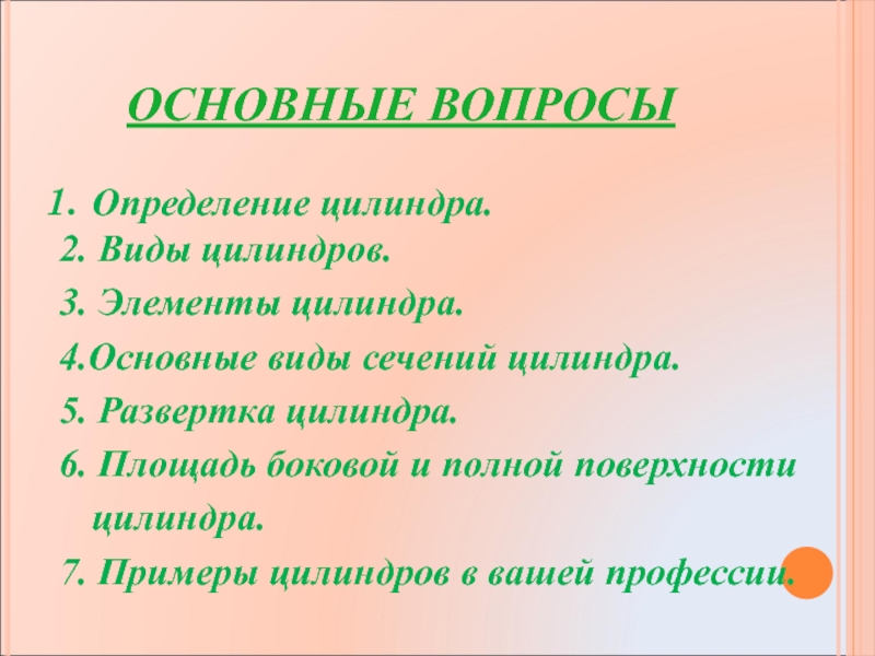 Плоскость сечения параллельна основаниям цилиндра и перпендикулярна оси. В сечении –
