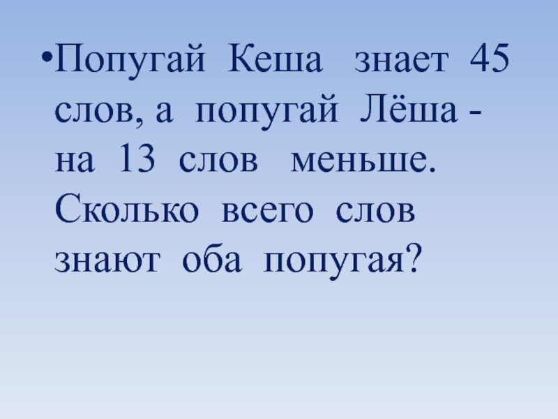 Попугай Кеша  знает 45 слов, а попугай Лёша - на 13 слов  меньше. Сколько всего