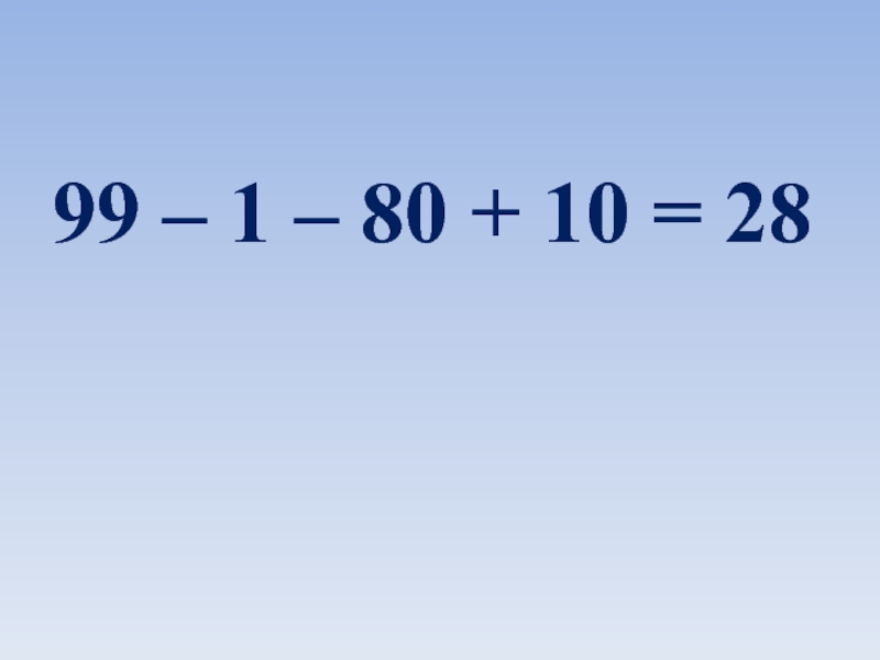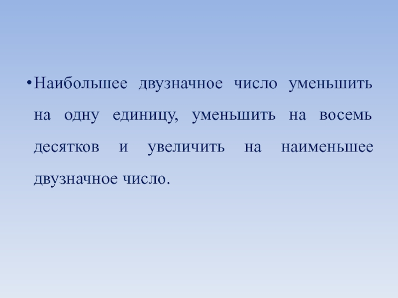 Слайд 16Наибольшее двузначное число уменьшить на одну единицу, уменьшить на восемь десятков