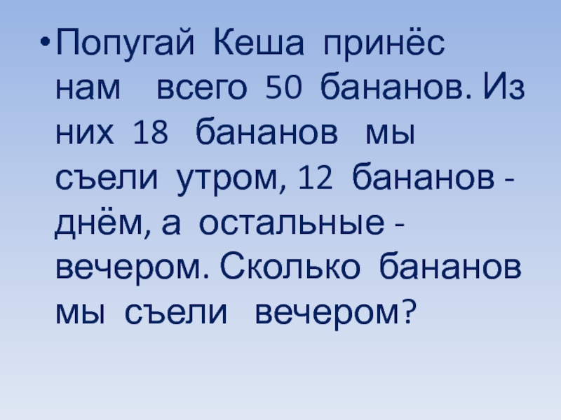 Попугай Кеша принёс нам  всего 50 бананов. Из них 18  бананов  мы съели утром,