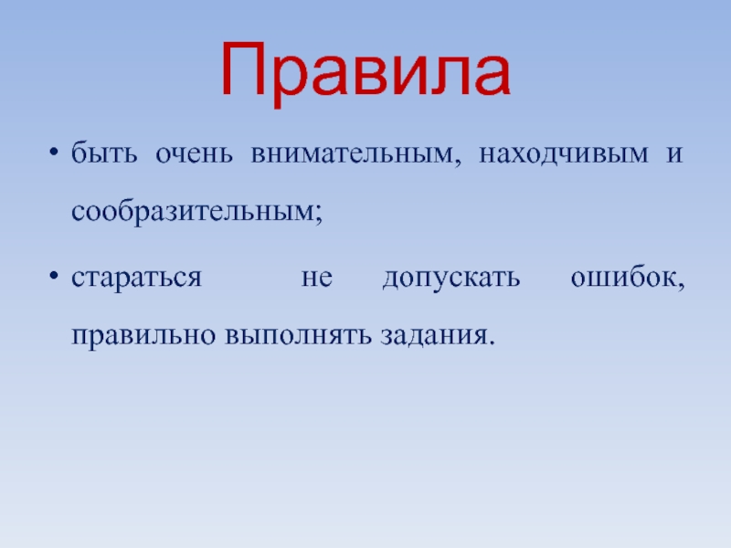 Правилабыть очень внимательным, находчивым и сообразительным;стараться не допускать ошибок, правильно выполнять задания.