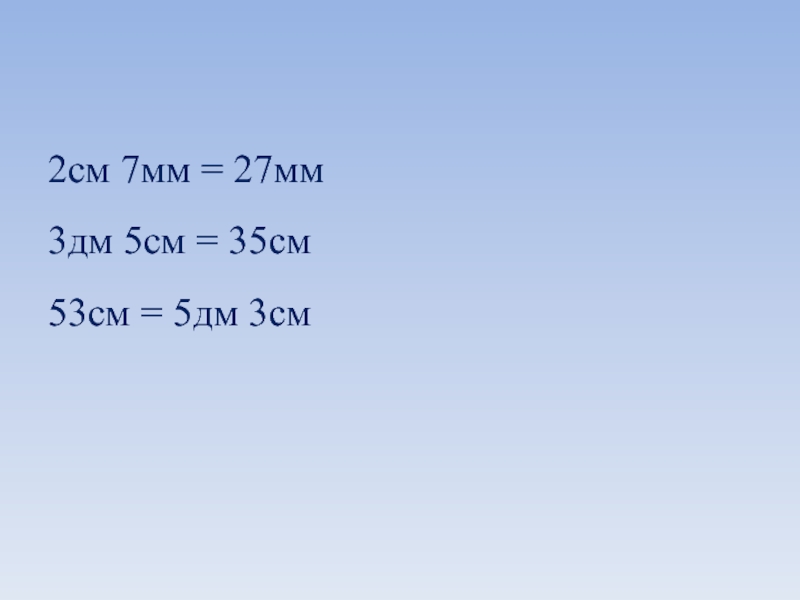 2см 7мм = 27мм 3дм 5см = 35см 	53см = 5дм 3см