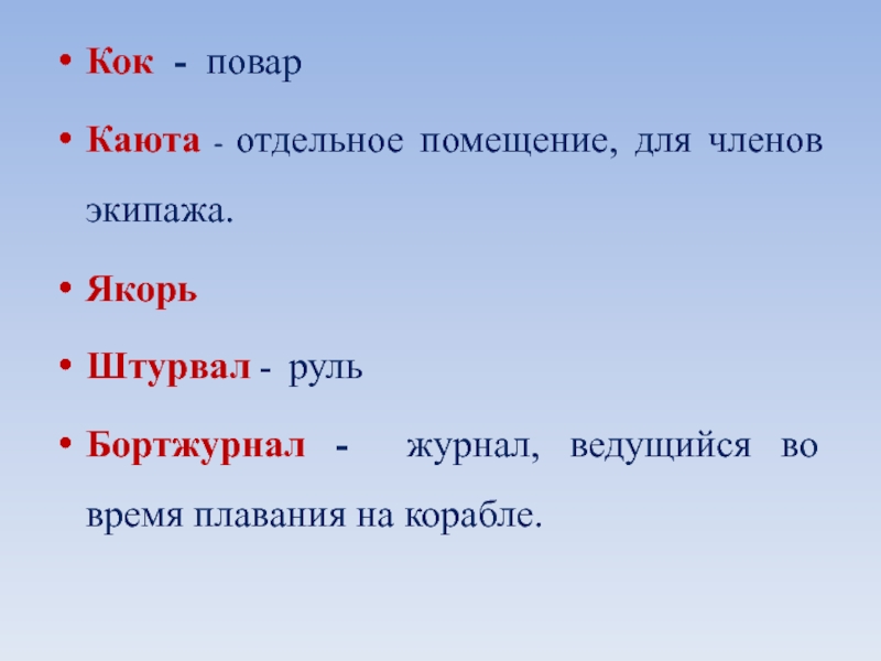 Кок - поварКаюта - отдельное помещение, для членов экипажа. ЯкорьШтурвал - рульБортжурнал - журнал, ведущийся во время