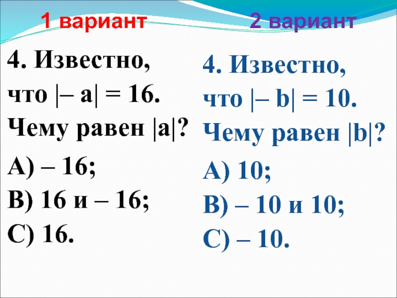 4. Известно, что |– а| = 16. Чему равен |а|?