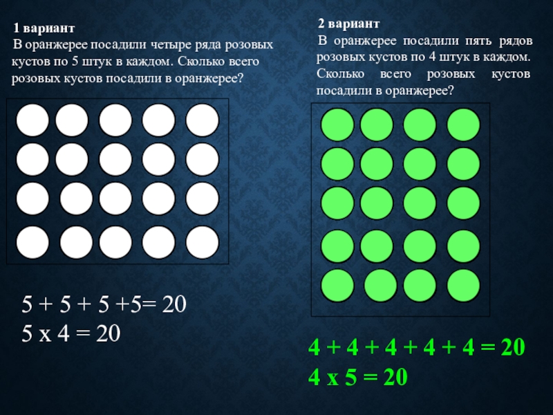 В оранжерее посадили пять рядов розовых кустов по 4 штук в каждом. Сколько всего розовых кустов посадили в оранжерее?