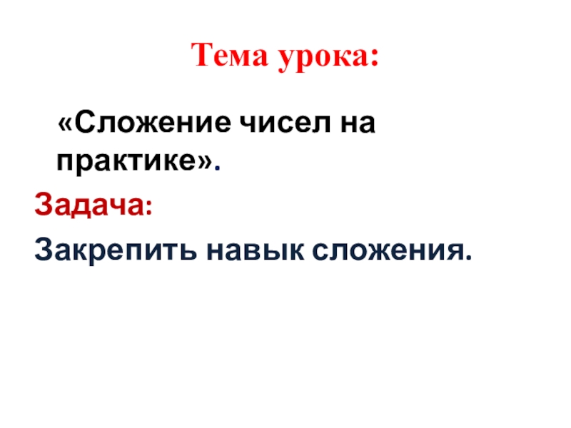 Тема урока:  «Сложение чисел на практике».Задача: Закрепить навык сложения.