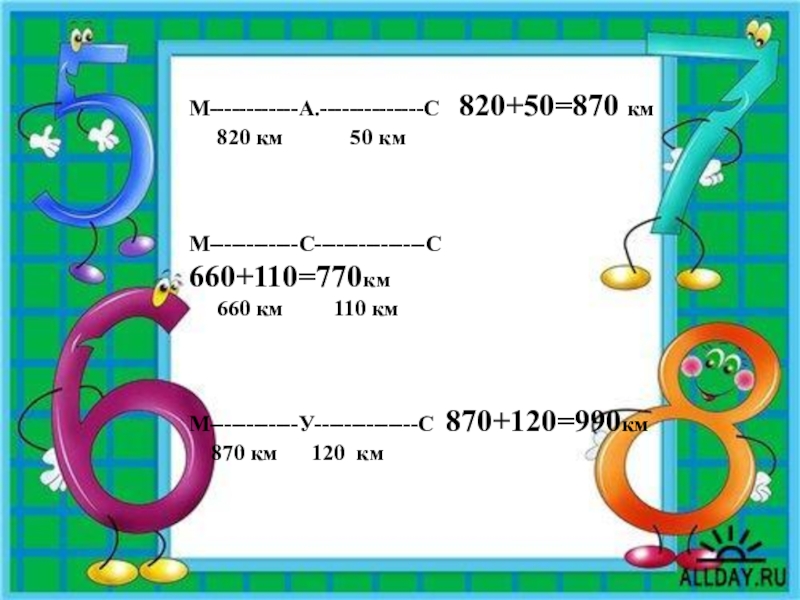 Слайд 10М------------А.--------------С   820+50=870 км
