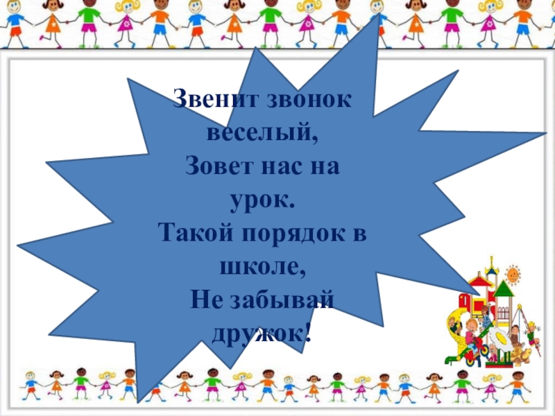 Звенит звонок веселый, Зовет нас на урок. Такой порядок в школе, Не забывай дружок!