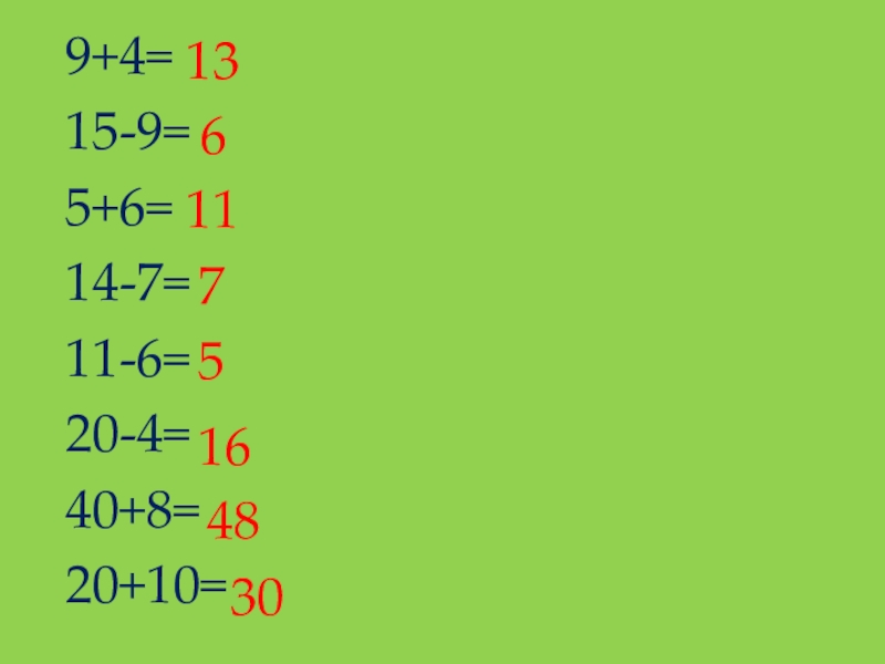 9+4=15-9=5+6=14-7=11-6=20-4=40+8=20+10=1361175164830