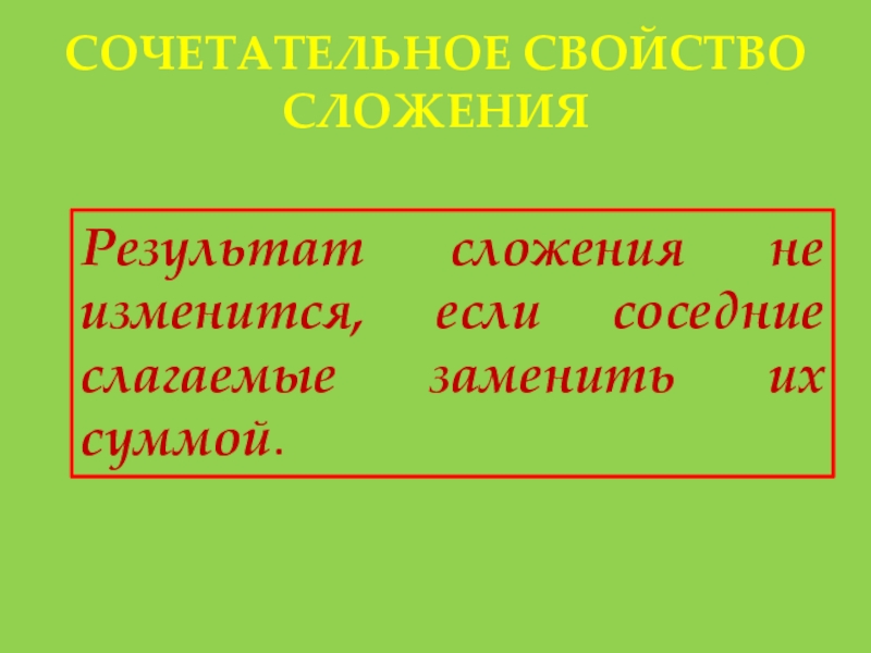 СОЧЕТАТЕЛЬНОЕ СВОЙСТВО СЛОЖЕНИЯРезультат сложения не изменится, если соседние слагаемые заменить их суммой.