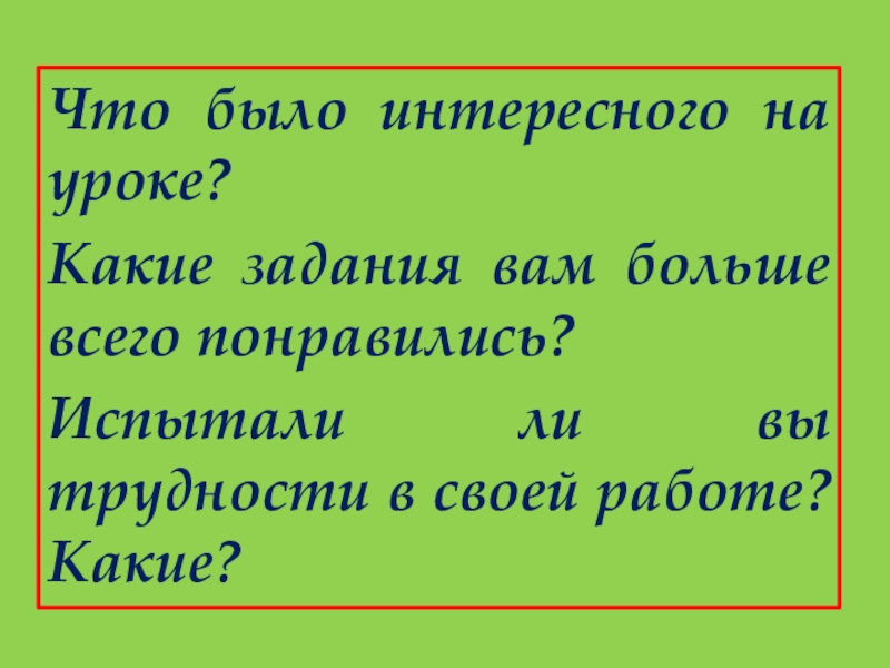 Что было интересного на уроке? Какие задания вам больше всего понравились? Испытали ли вы трудности в своей