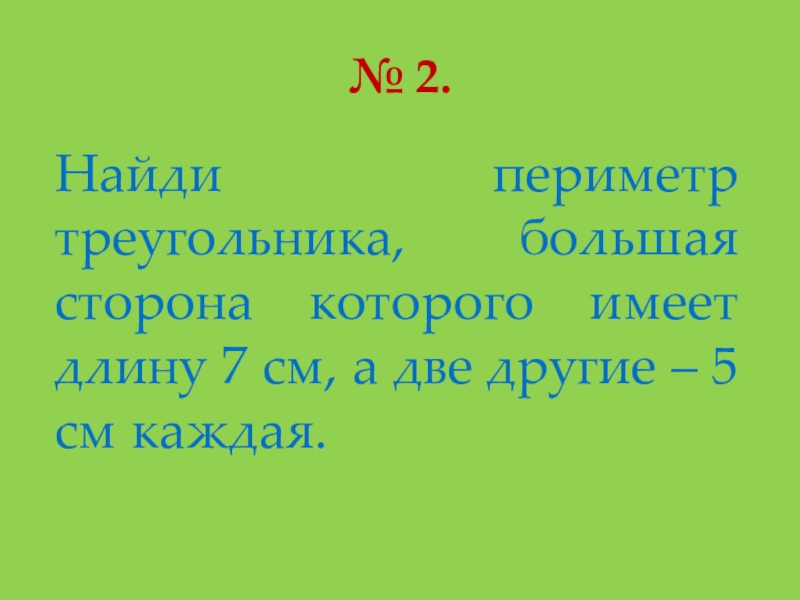 № 2.Найди периметр треугольника, большая сторона которого имеет длину 7 см, а две другие – 5 см