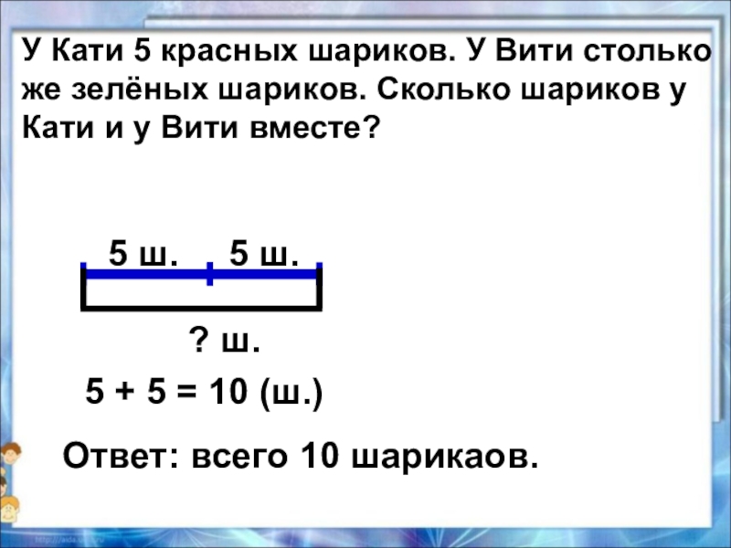 У Кати 5 красных шариков. У Вити столько же зелёных шариков. Сколько шариков у Кати и у Вити вместе?
