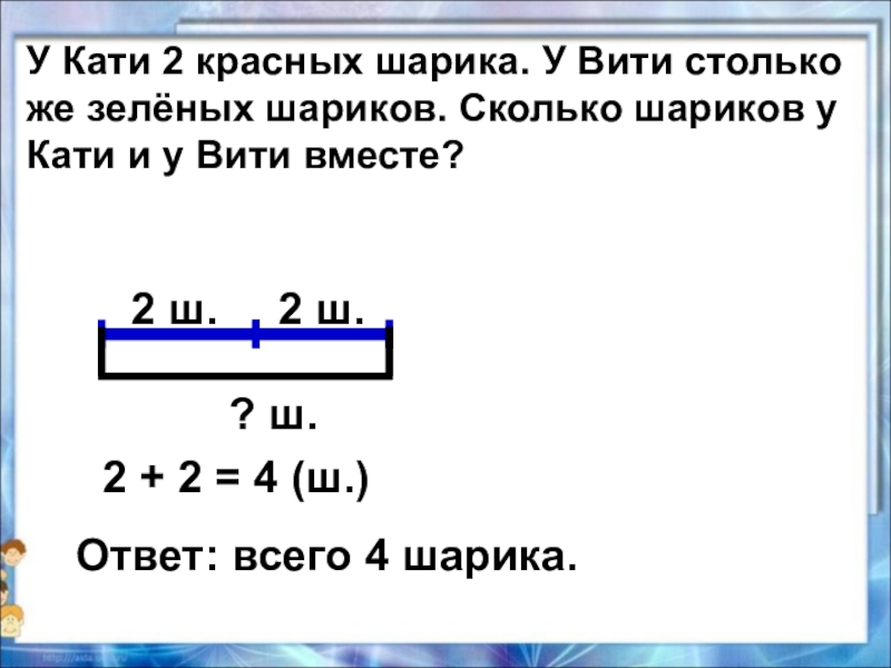 У Кати 2 красных шарика. У Вити столько же зелёных шариков. Сколько шариков у Кати и у Вити вместе?