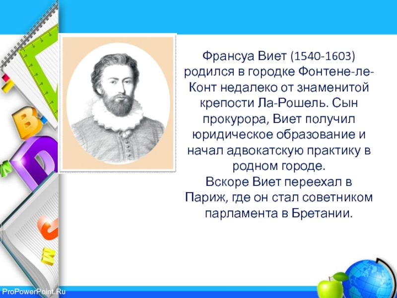 Слайд 15Франсуа Виет (1540-1603) родился в городке Фонтене-ле-Конт недалеко от знаменитой крепости