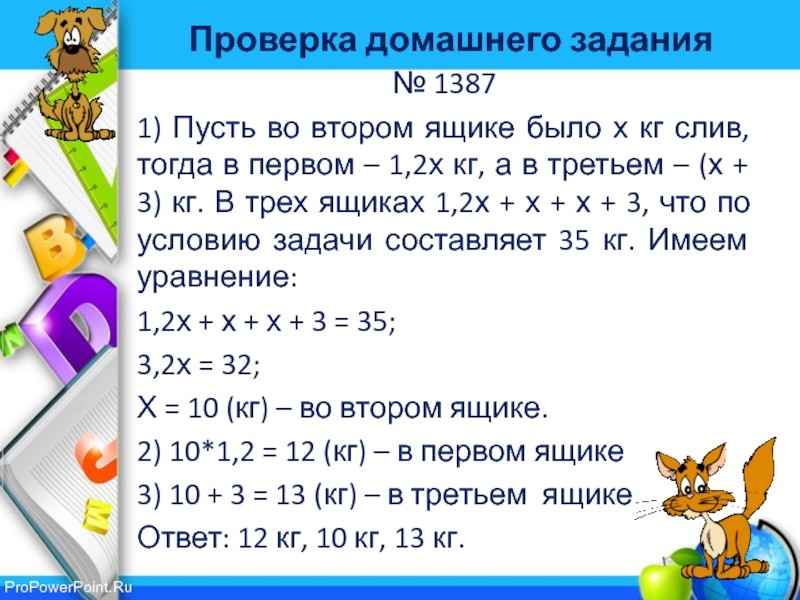 слив, тогда в первом – 1,2х кг, а в третьем – (х + 3) кг. В трех ящиках 1,2х + х + х + 3, что по условию задачи составляет 35 кг. Имеем уравнение: