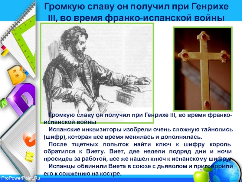Слайд 16Громкую славу он получил при Генрихе III, во время франко-испанской войны