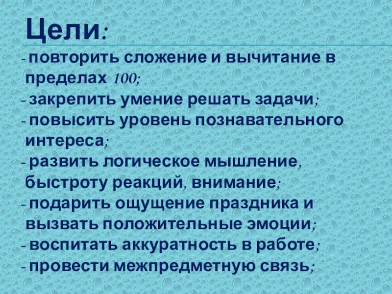 Цели: повторить сложение и вычитание в пределах 100; закрепить умение решать задачи; повысить уровень познавательного интереса; развить