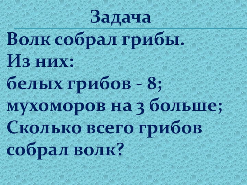 ЗадачаВолк собрал грибы. Из них: белых грибов - 8;мухоморов на 3 больше;Сколько всего грибов собрал волк?