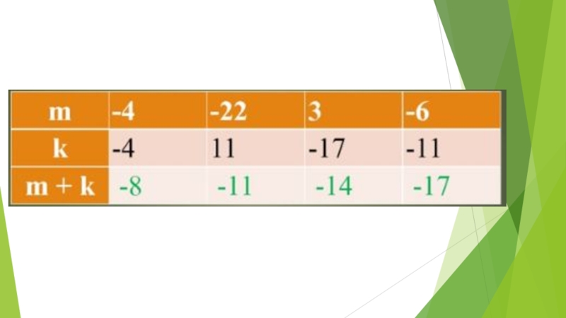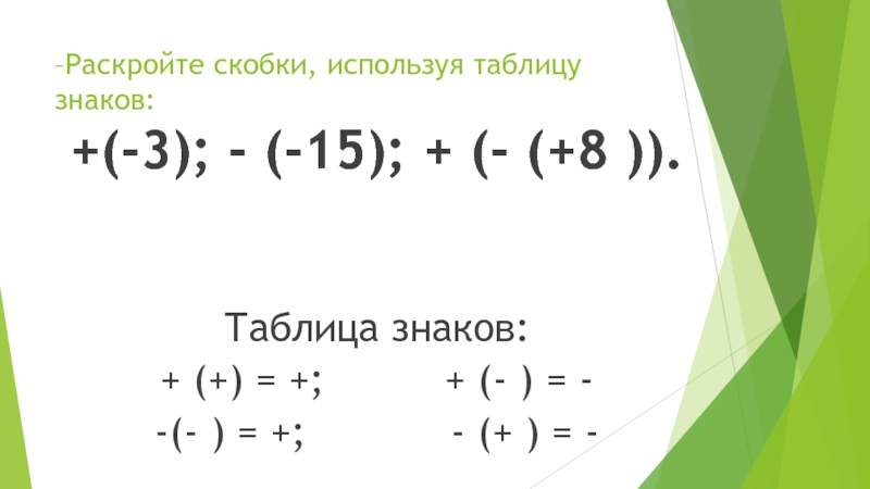 –Раскройте скобки, используя таблицу знаков: +(-3); - (-15); + (- (+8 )).Таблица знаков:+ (+) = +;