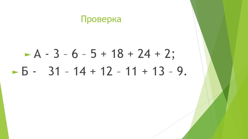 ПроверкаА - 3 – 6 – 5 + 18 + 24 + 2;Б -   31 – 14 +