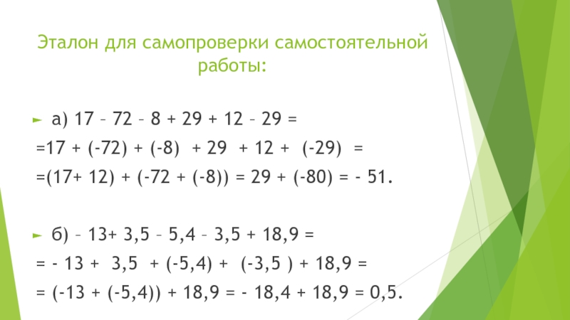 Эталон для самопроверки самостоятельной работы: а) 17 – 72 – 8 + 29 + 12 – 29