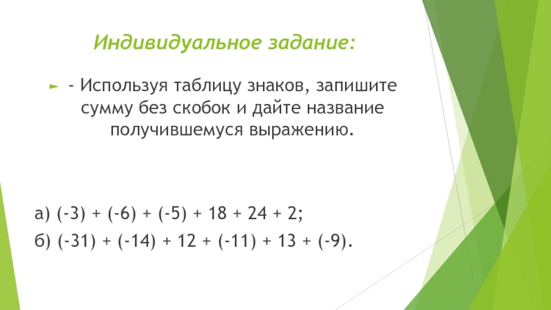 Индивидуальное задание: - Используя таблицу знаков, запишите сумму без скобок и дайте название получившемуся выражению.а) (-3) +