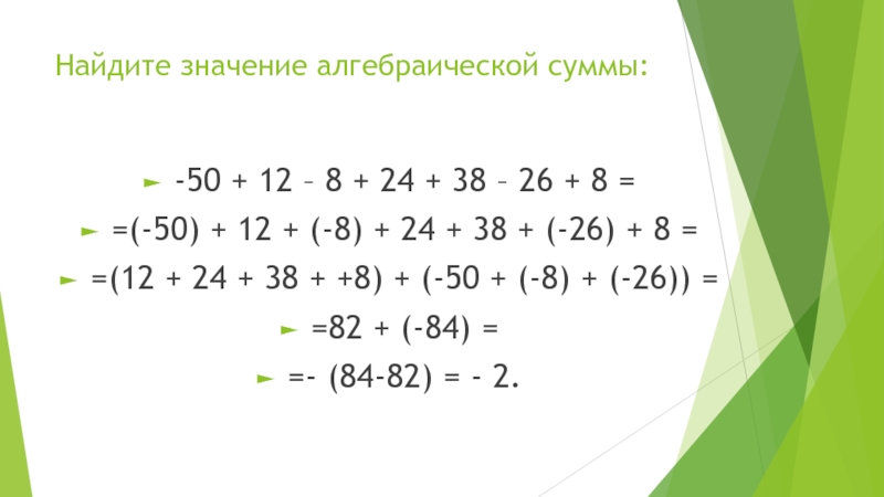 Найдите значение алгебраической суммы: -50 + 12 – 8 + 24 + 38 – 26 + 8