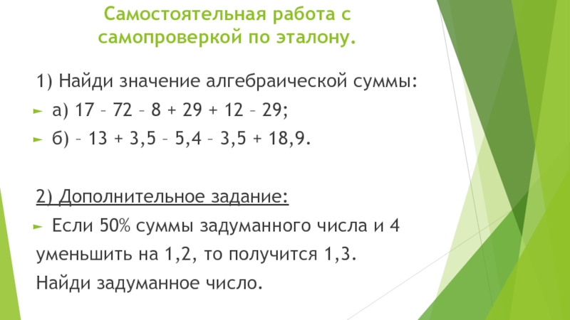 Самостоятельная работа с самопроверкой по эталону. 1) Найди значение алгебраической суммы:а) 17 – 72 – 8 +