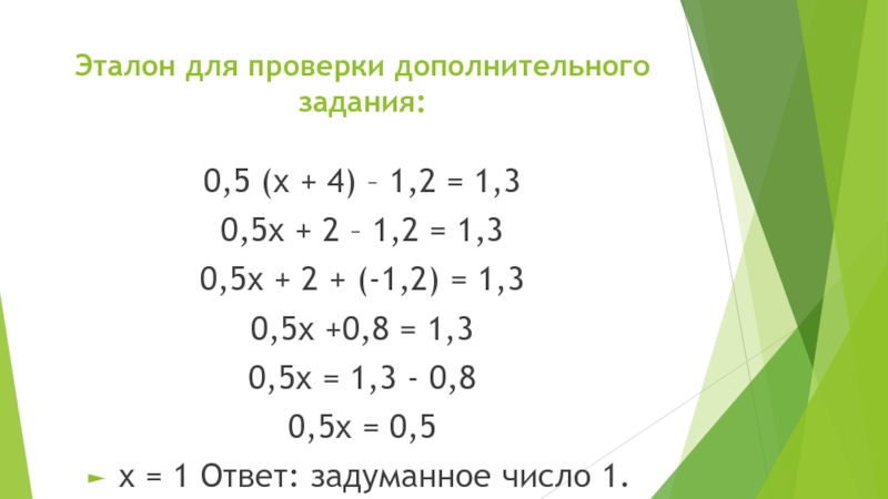 Эталон для проверки дополнительного задания: 0,5 (х + 4) – 1,2 = 1,30,5х + 2 – 1,2