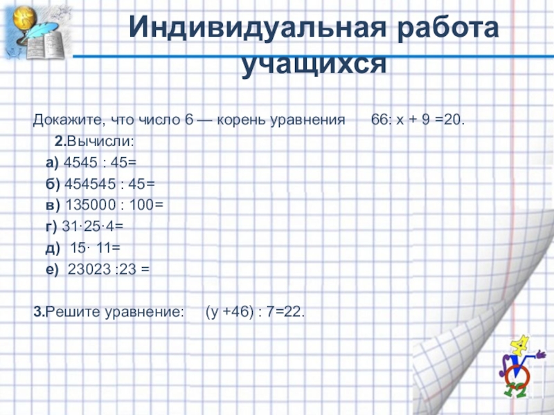 Индивидуальная работа учащихся  Докажите, что число 6 — корень уравнения   66: х