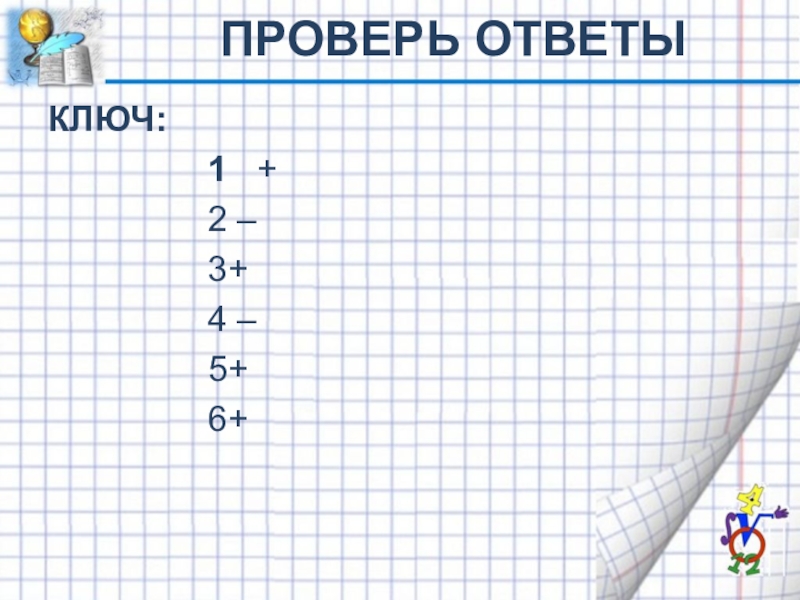 ПРОВЕРЬ ОТВЕТЫКЛЮЧ:         				1  +				2 – 				3+				4 – 				5+