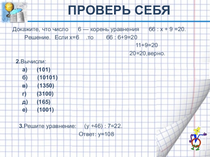 ПРОВЕРЬ СЕБЯДокажите, что число   6 — корень уравнения   66 : х + 9