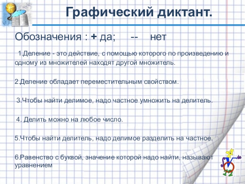 Графический диктант. Обозначения : + да; -- нет 1.Деление - это действие, с помощью которого по произведению и одному из множителей находят другой множитель. 2.Деление обладает переместительным свойством. 3.Чтобы найти делимое, надо