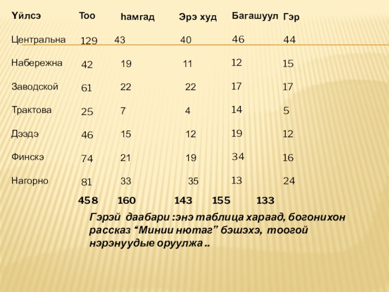 Гэрэй даабари :энэ таблица хараад, богонихон рассказ “Минии нютаг” бэшэхэ, тоогой нэрэнуудые оруулжа ..