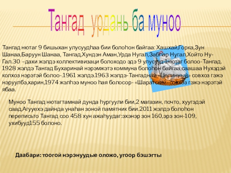 Муноо Тангад нютагтамнай дунда hургуули бии,2 магазин, почто, хуугэдэй саад,Агууехэ дайнда унаhан зоной памятник бии.2011 жэлдэ болоhон переписьто Тангад соо 458 хун ажаhуудаг:эхэнэр зон 160,эрэ зон-109,ухибууд155 болоно.