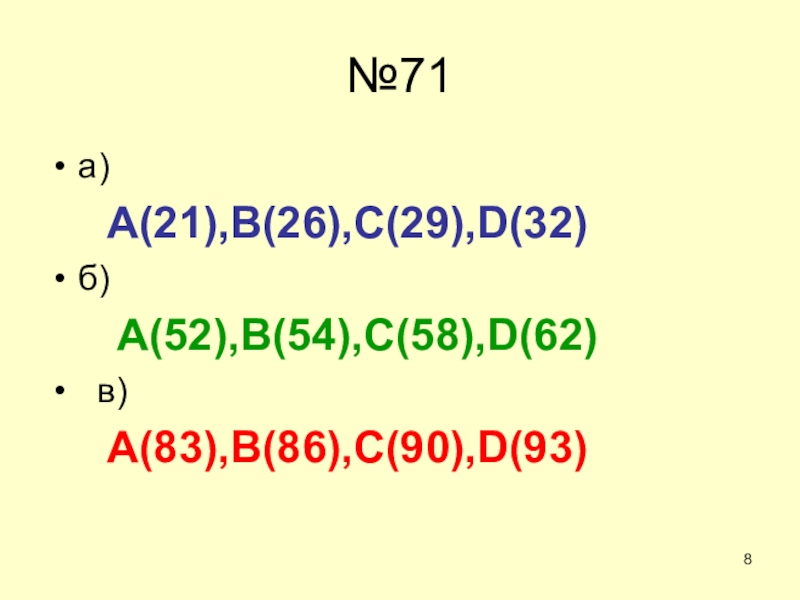 №71а)   А(21),В(26),С(29),D(32)б)    A(52),B(54),C(58),D(62) в)   A(83),B(86),C(90),D(93)