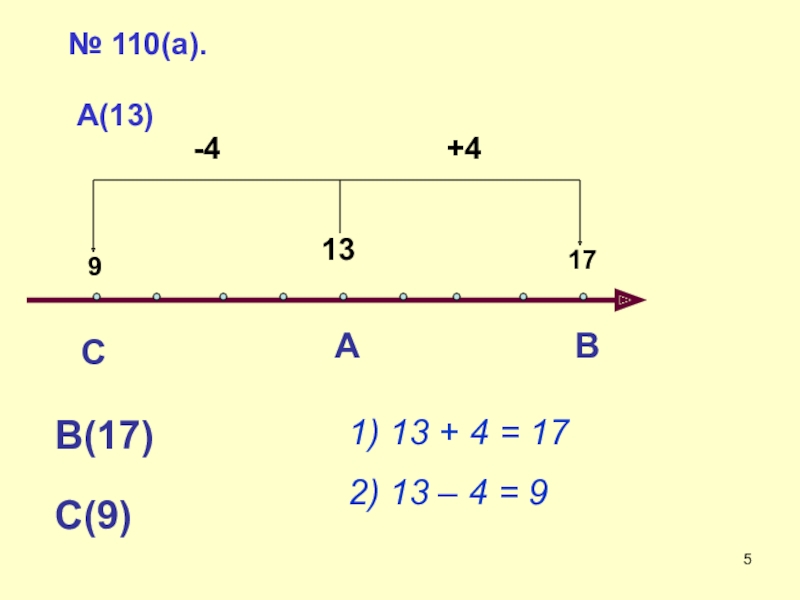 № 110(а). А(13)АВВ(17)СС(9)1) 13 + 4 = 172) 13 – 4 = 913+4-4179