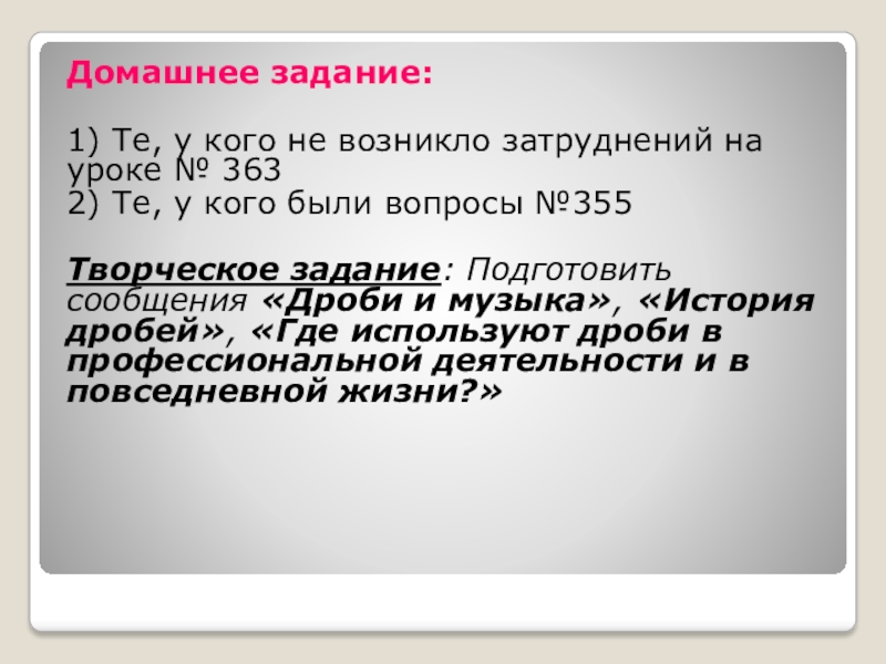 Творческое задание: Подготовить сообщения «Дроби и музыка», «История дробей», «Где используют дроби в профессиональной деятельности и в повседневной жизни?»