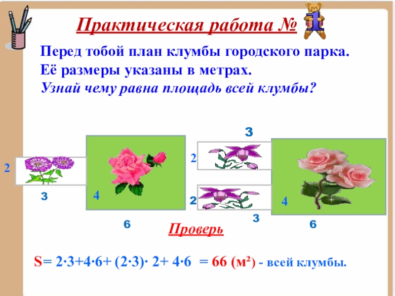 S= 2∙3+4∙6+ (2∙3)∙ 2+ 4∙6 = 66 (м²) - всей клумбы.