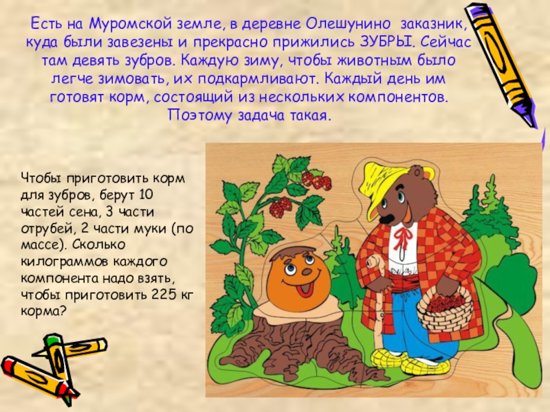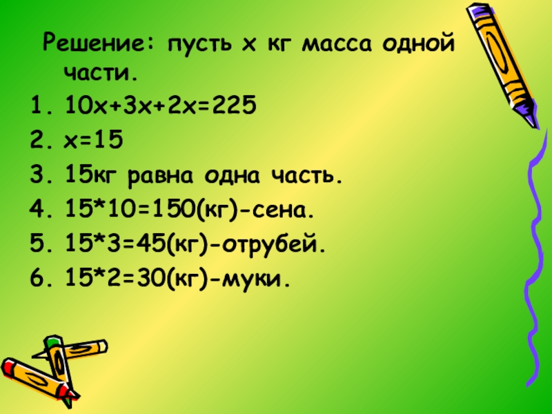 Чтобы приготовить корм для зубров, берут 10 частей сена, 3 части отрубей, 2 части муки (по массе). Сколько килограммов каждого компонента надо взять, чтобы приготовить 225 кг корма?