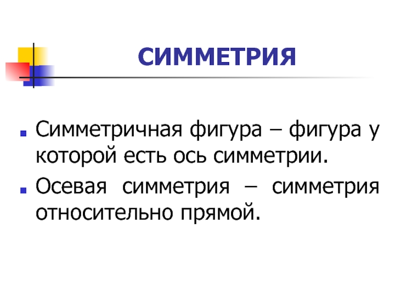 СИММЕТРИЯСимметричная фигура – фигура у которой есть ось симметрии.Осевая симметрия – симметрия относительно прямой.