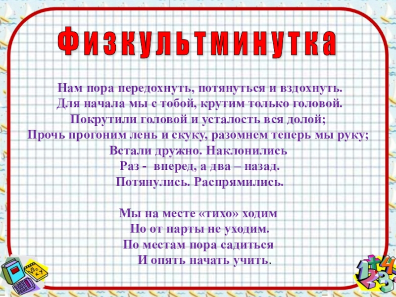 Нам пора передохнуть, потянуться и вздохнуть.