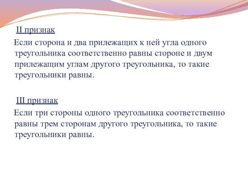 II признак  Если сторона и два прилежащих к ней угла одного треугольника соответственно равны